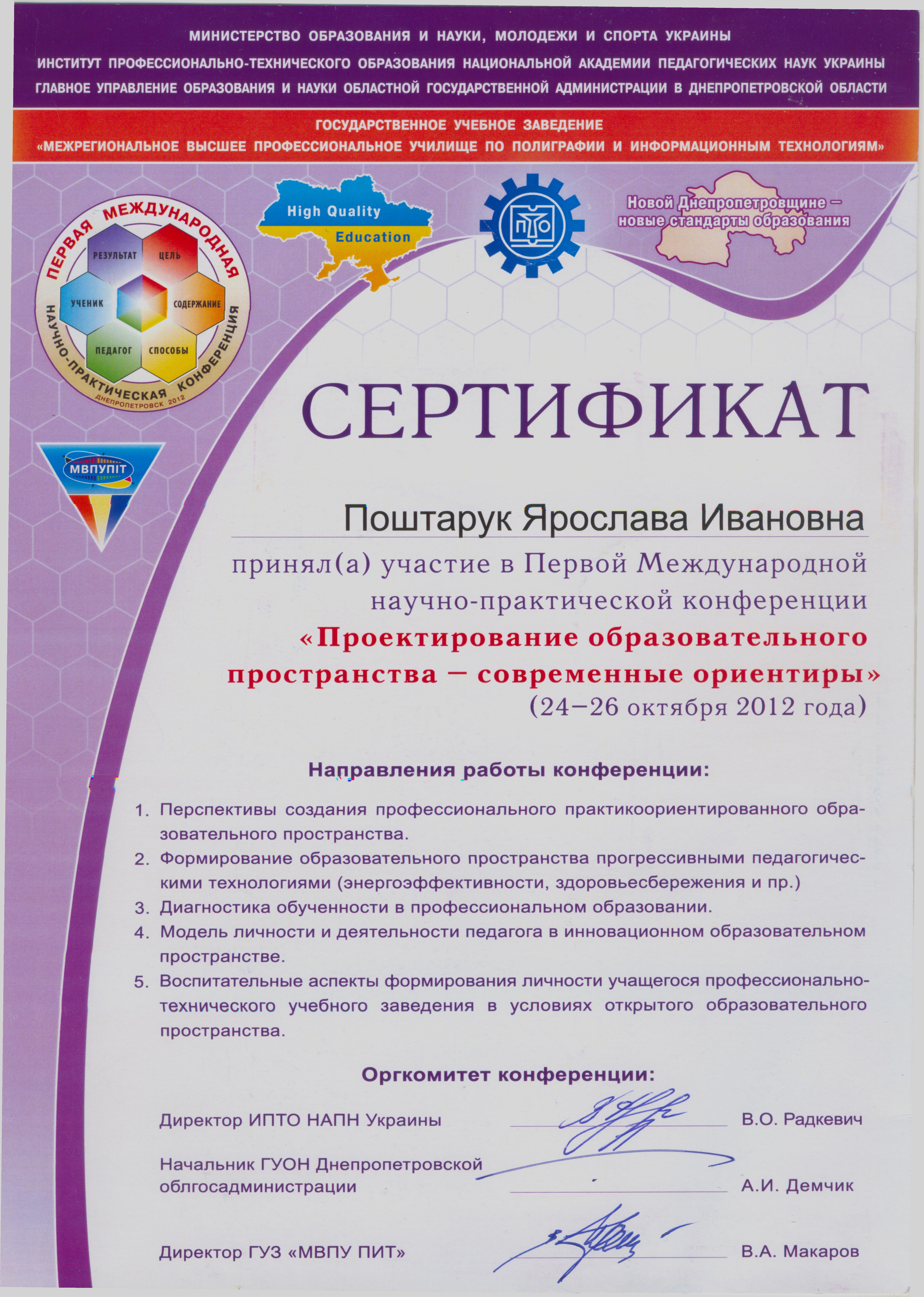 Поштарук Ярослава Іванівна взяла участь у першій міжнародній науково-практичній конференції "Проектування освітнього простору - сучасні орієнтири"